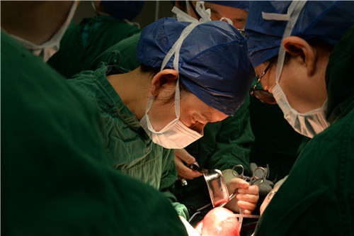 6月4日,一台全省首例、全国罕见的手术开始了。武汉协和医院王泽华、贺晓琪两位专家与赵敏同台为患者手术。手术室副护士长李昕,麻醉科主任吕改华在术前,术中亲临现场,指挥协调手术及抢救设备和手术室人员,确保手术及抢救的顺利进行。手术期间,先行剖宫产术,9时14分剖娩一女婴,1090g,大家悬着的心暂时放了下来,一个小生命的到来,让这位癌症妈妈有了些许安慰。此时,手术室里早已等待的新生儿专家对其进行初步检查后,由儿科医生及助产士迅速护送至我院长治路院区新生儿重症医学科,为这个新生命的健康开始保驾护航。孩子安全了,但是妈妈还没有离开手术台,因为等待她的将是开腹广泛子宫切除术+右侧附件切除术+左侧输卵管切除术+盆腔淋巴结切除术等一系列复杂、高难度的手术流程。